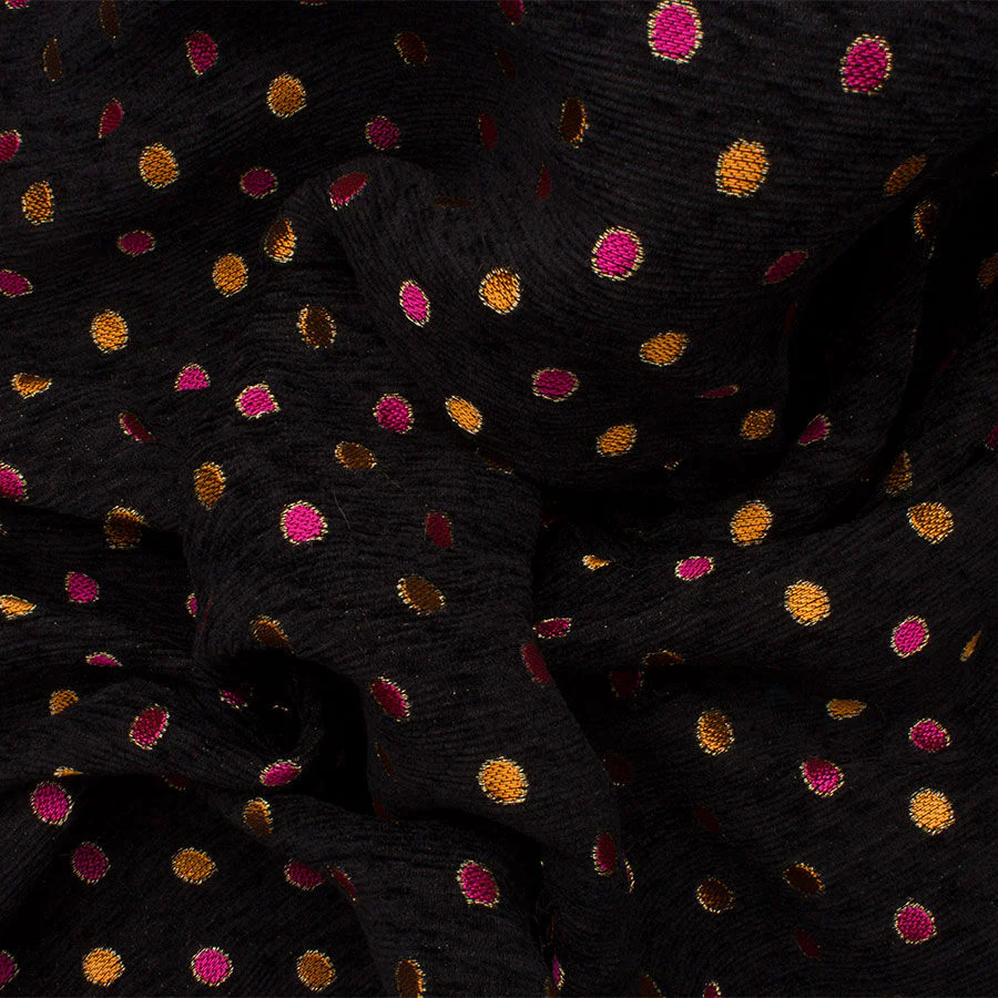A black chenille brocade with a fun orange and pink spot design by Abraham. This thicker brocade is ideal for skirts and jackets. Take a look at our full range of brocades for more inspiration.