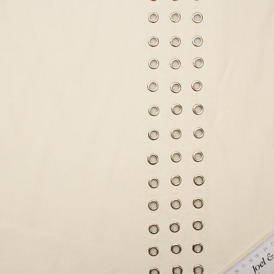 A classic cream wool blend fabric with a twist - featuring a triple row silver eyelet border on one side. The border is ideal for trimming skirts, jackets, dresses and trousers. Perfect for autumn/winter tailoring.