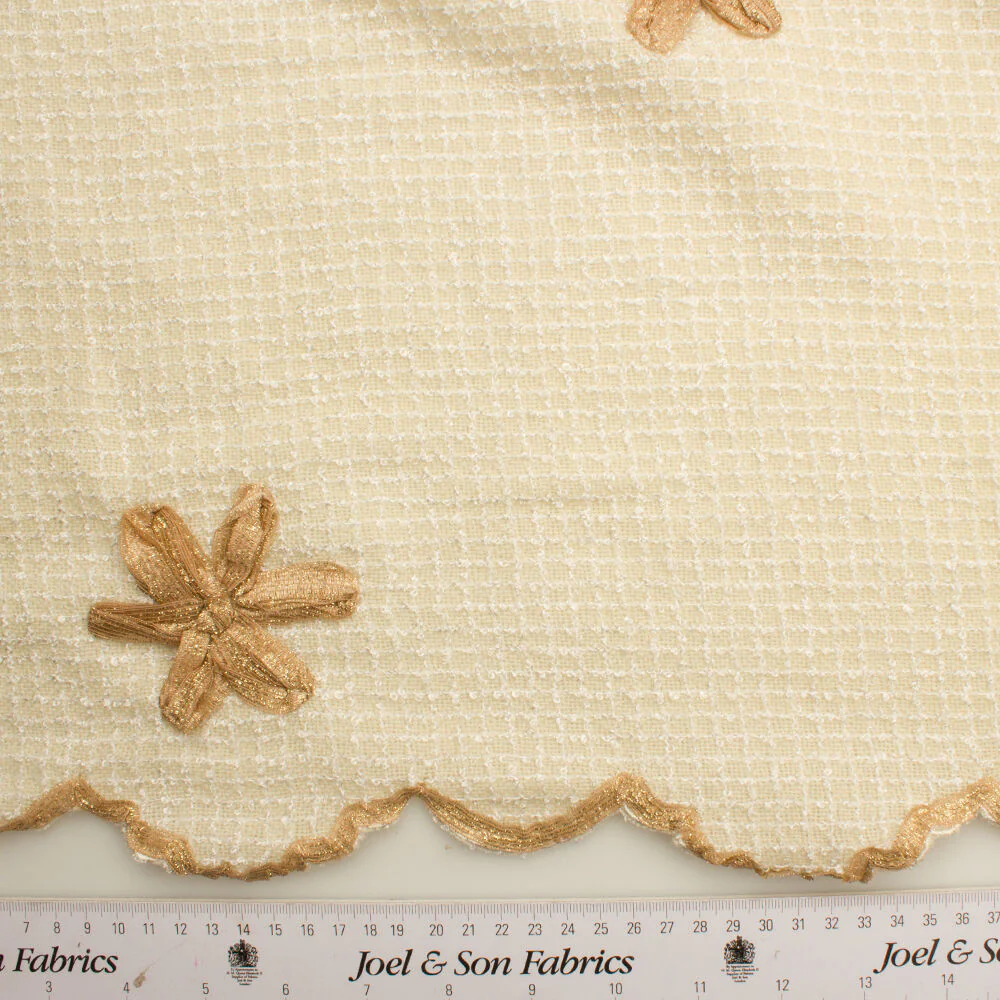 A cream coloured wool mix bouclé with a pretty gold embroidered floral ribbon. This fabric is ideal for Chanel inspired suits, dresses & Jackets. Seen on all this seasons catwalks. New in. Whilst stocks last.