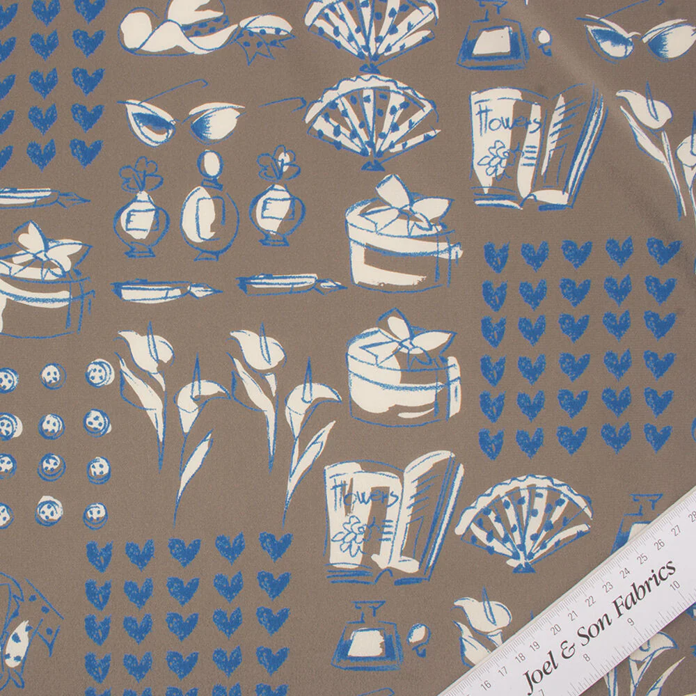An elephant grey printed silk crêpe de chine. Soft and lightweight, this silk would be ideal for a dress, skirt or blouse.