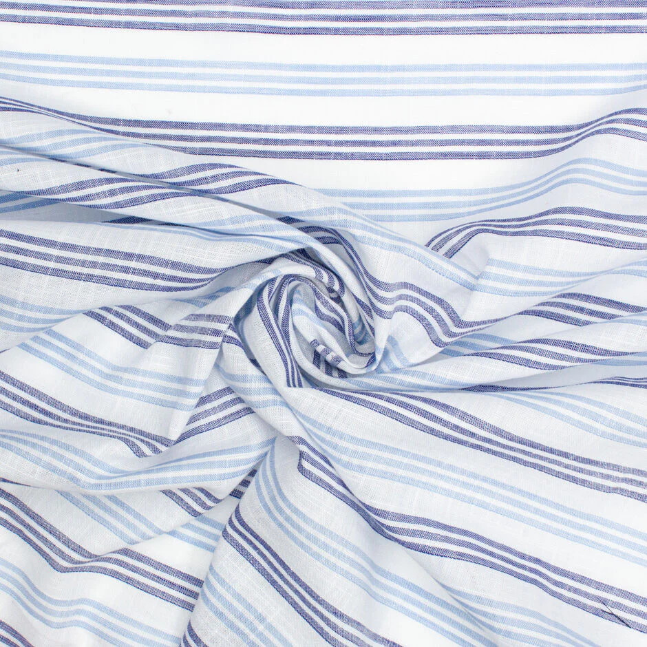 A multi blue striped white pure linen fabric. Creasing elegantly, this lightweight and breathable cloth provides an excellent coolness for the hotter weather making it the perfect choice for summer shirting, trousers and shorts.