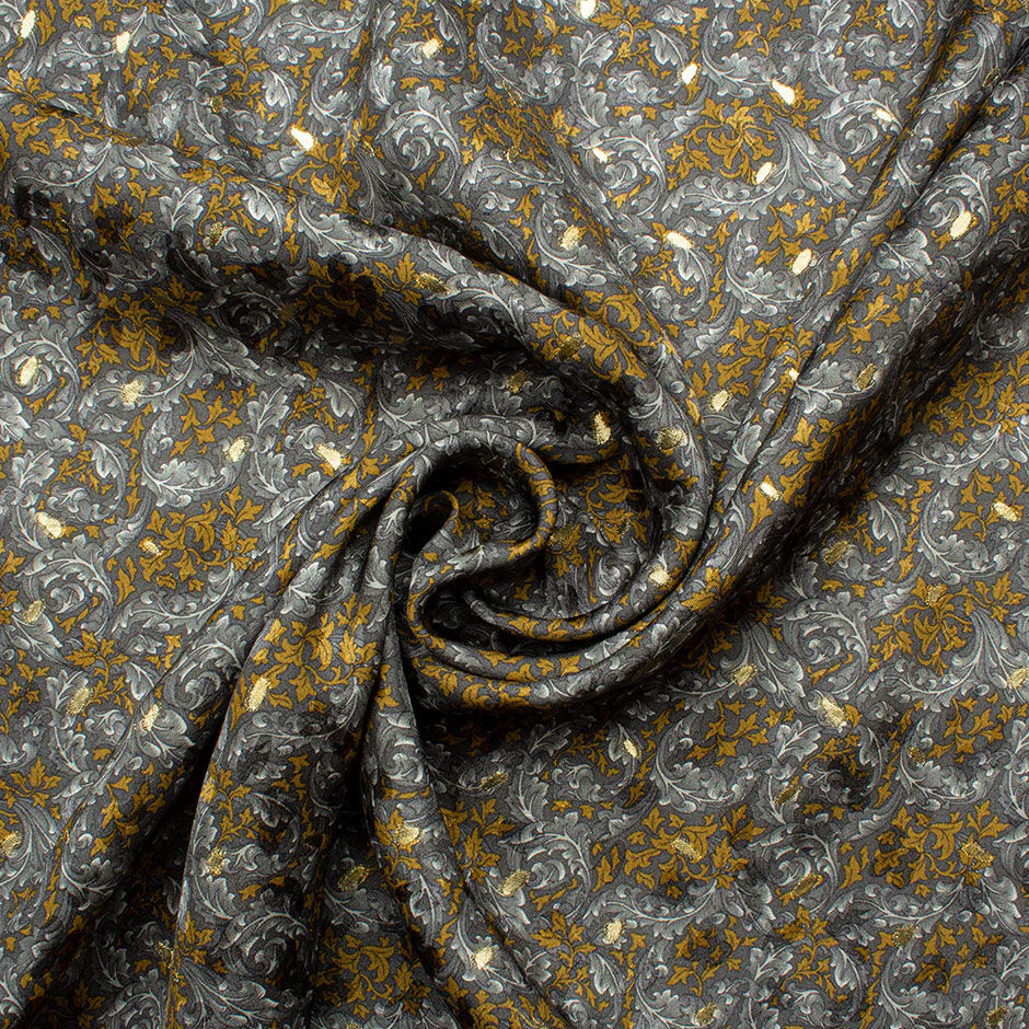 An elegant dark gold and grey leaf printed grey silk fabric with delicate gold metallic jacquard. Made in Italy, this medium weight silk fabric is ideal for an eye catching blouse.