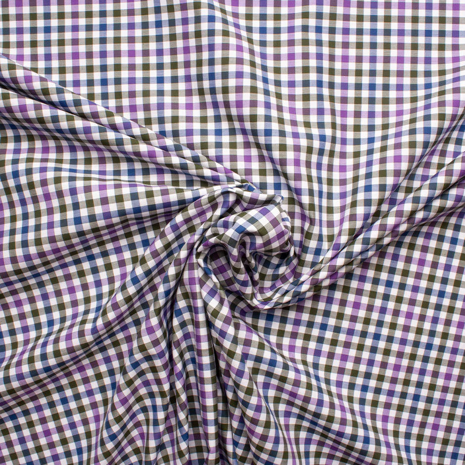 A smart french blue, mid grey and rich purple gingham check on a white background. This pure cotton shirting fabric is ideal for an all year round shirt and available in various colours.