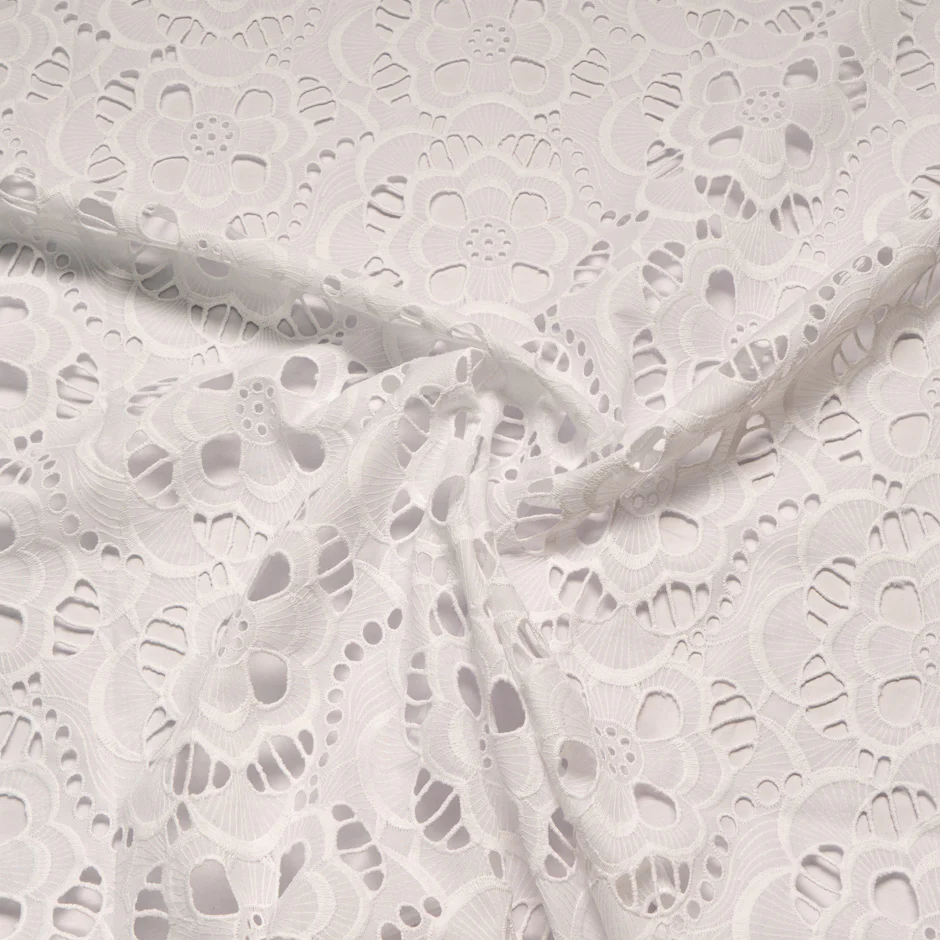 Embroidered cotton, also known as broderie anglaise is the perfect summer weight fabric. Featuring a white geometric floral open work design, this cotton fabric is breathable making it ideal for summer dresses, maxi skirts and short-sleeve tops.