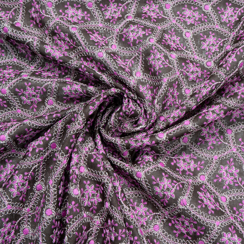 A dark brown handkerchief linen with a busy magenta pink floral embroidery. Creases naturally, this durable fabric is twice as strong as cotton and ideal for practical tailoring, such as unstructured dresses, skirts and trousers.