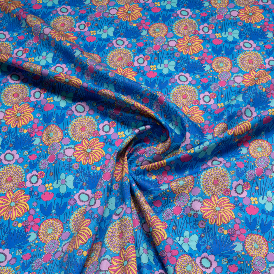 A fun retro floral print on a rich blue pure cotton. Made in Italy, this luxury cotton is available in a variety of colours and prints, and is ideal for shirts, dresses and skirts.