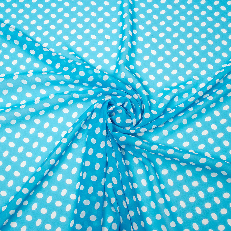 An oval white spotted rich turquoise printed pure silk georgette fabric by Abraham. Made up, this sheer flowing fabric would look stunning as a dress, layered skirt or blouse and available in a wide variety of colours.